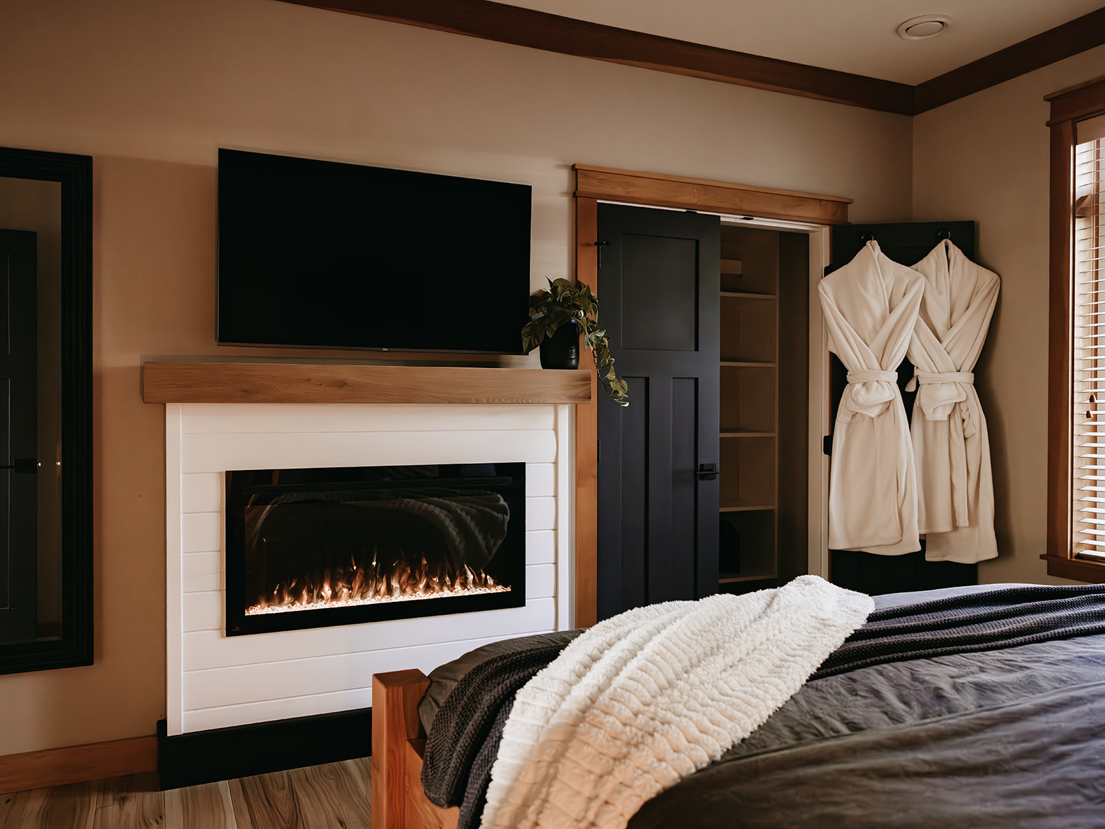 The Suite is a private space for guests that boasts a fully equipped kitchen and dining space, living room, king sized bed and fireplace, bathroom, and private patio. Guests also have access to the hot tub that is shared with the owners.